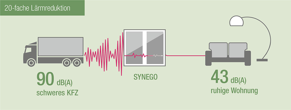 Täglich sind Sie von lauten Geräuschen umgeben: Mal ist es lästiger Verkehrslärm, mal der störende Rasenmäher des Nachbarn. Mit SYNEGO Hebeschiebetüren schließen Sie den Lärm einfach aus und machen Ihr Zuhause zu einer wahren Ruheoase – und das bei effizienter Wärmedämmung. Dank der Schallschutzmaßnahmen wird eine bis zu 20-fache Lärmreduktion erreicht.